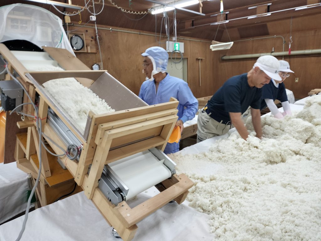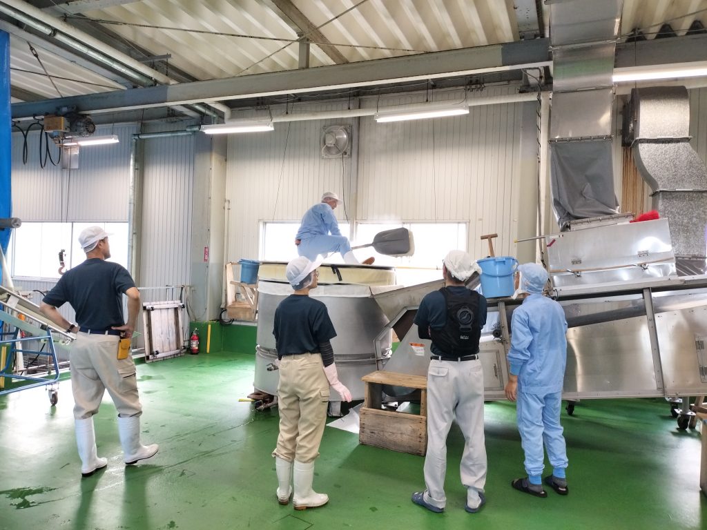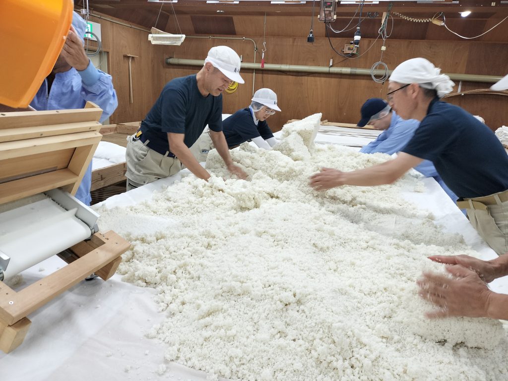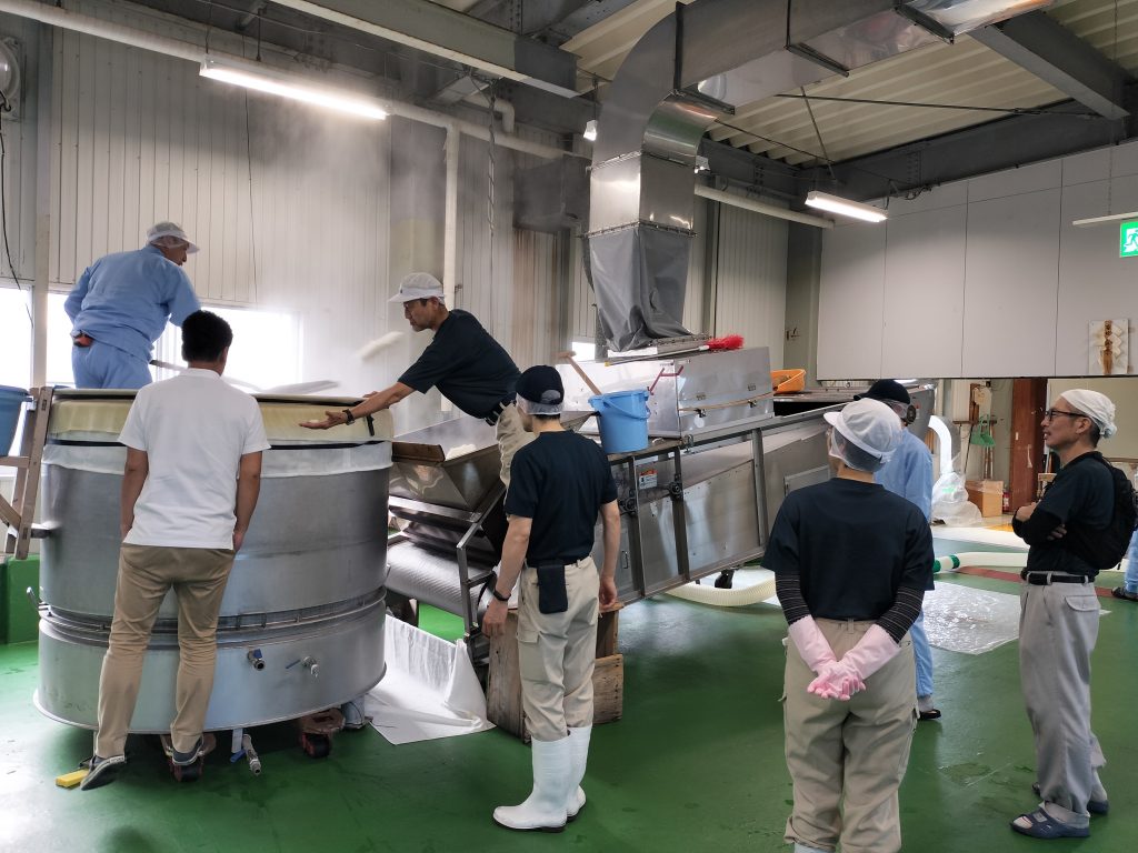 初蒸しのお米を製造部の皆で確かめていると、社長も様子を見に来られて、一緒に蒸し加減を確認しました。