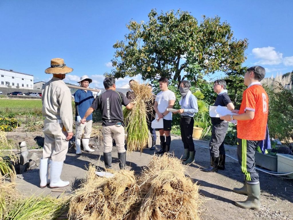 1日目は、翌日の稲刈作業の説明、模擬訓練、そして菊姫と吉川町に関しての研修などを行います。